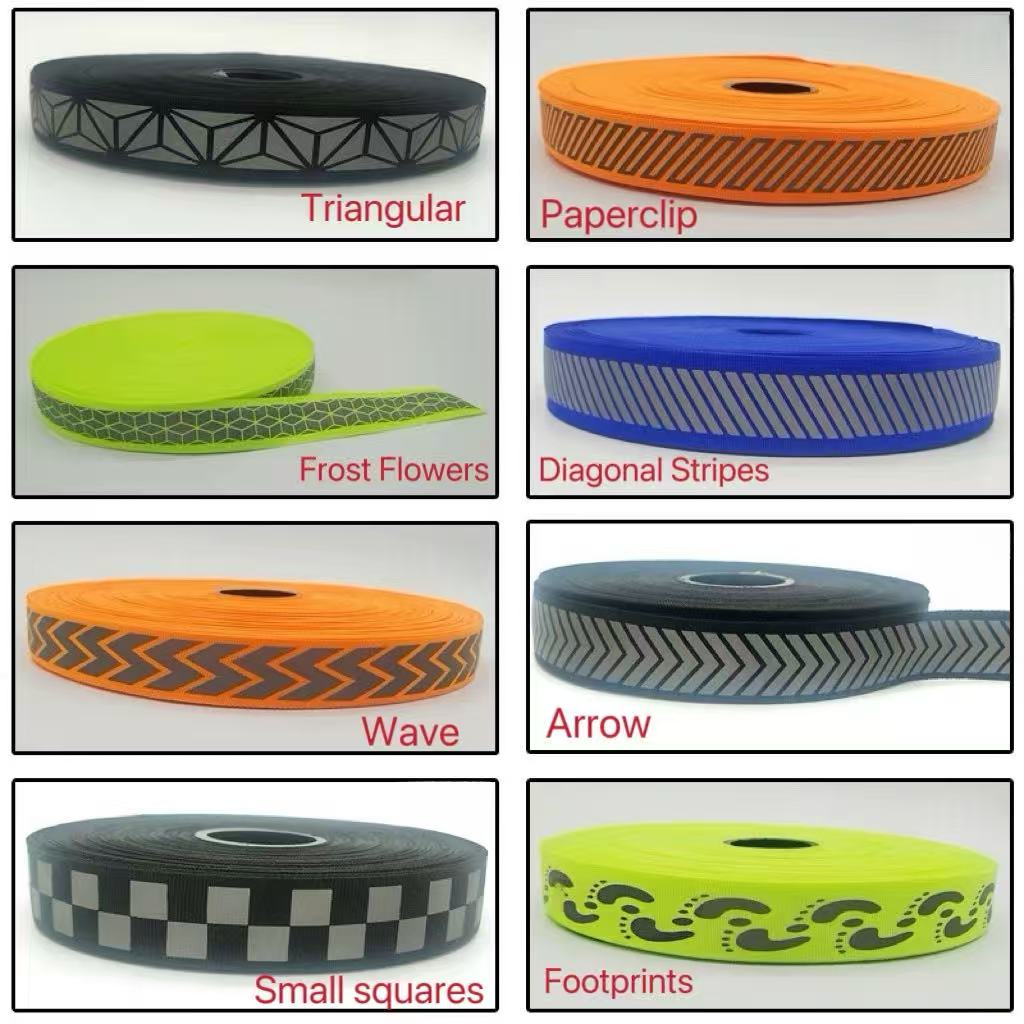 Esta cinta apresenta padrões personalizáveis em material reflexivo elástico altamente visível, combinando apelo decorativo com funcionalidade de segurança: